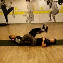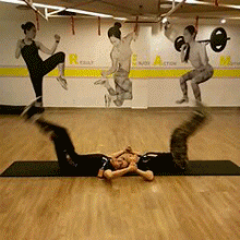 要求:兩人相反方向躺在瑜伽墊上,雙手握緊,雙腿并攏,腹部發(fā)力,向上抬腿,盡可能兩人腳尖能接觸后雙腿向下,腿不要碰到地面,反復(fù)循環(huán)。