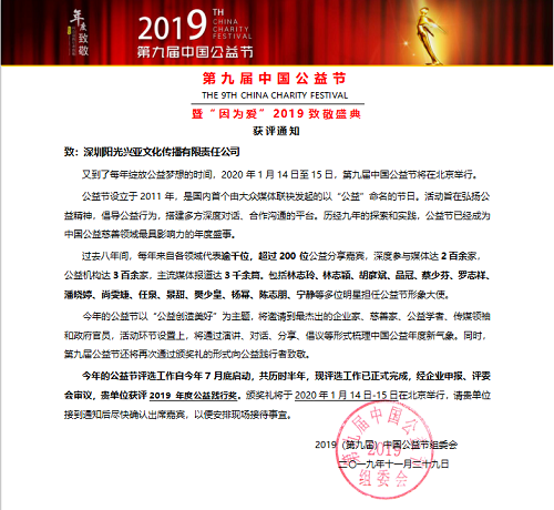 陽(yáng)光興亞榮獲中國(guó)公益節(jié)“2019 年度公益踐行獎(jiǎng)”